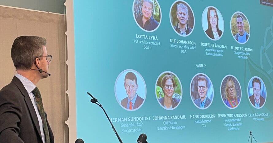 The invited panel included Lotta Lyrå, President and CEO of Södra, Ulf Johansson, Global Wood & Forestry Manager, IKEA, Elliot Eriksson, Forestry Student´s Union at SLU, Josefine Åhrman, General Secretary, Svenskt Friluftsliv, Herman Sundquist, Director General, Swedish Forest Agency, Johanna Sandahl, Chair, Swedish Society for Nature Conservation, Jenny Wik Karlsson, Head of Operation, Svenska Samernas Riksförbund, Erik Brandsma, President & CEO, Sveaskog and Hans Djurberg, Sustainability Director, SCA
