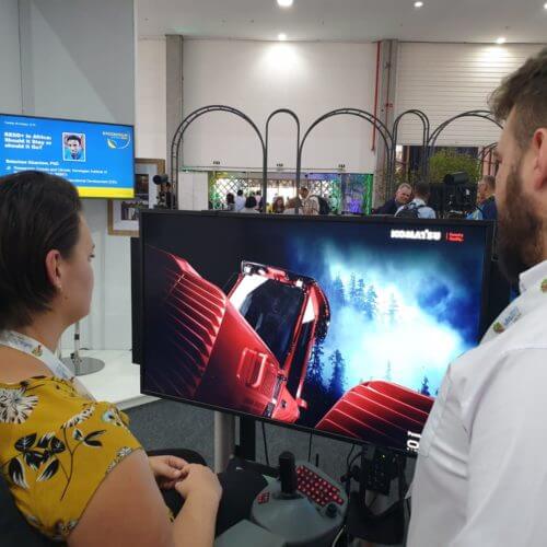 The pavilion includes a reception, speakers corner, a harvester simulator and a Wooden model of Skellefteå Kulturhus.